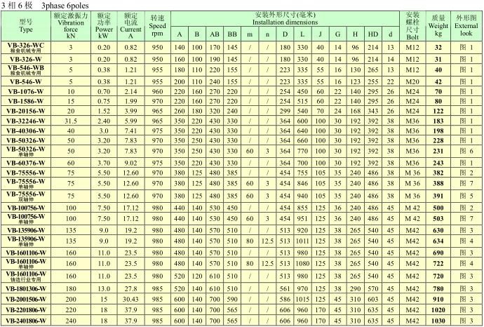 VB系列振动电机,功率0.12~25KW,2、4、6、8极,激振力为2.5~300KN,共计56个规格。